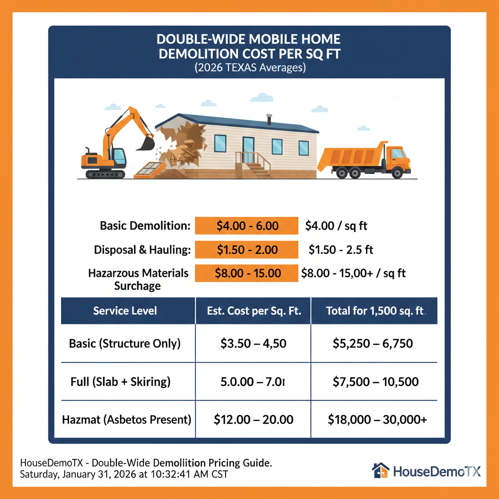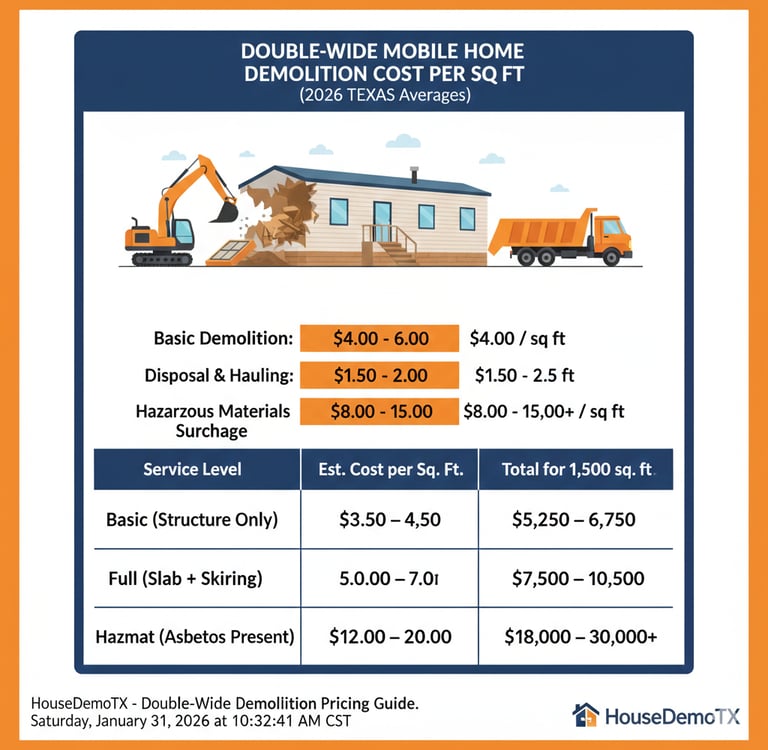 For a standard double-wide (approx. 1,000 to 2,000 sq. ft.), most licensed Texas contractors charge between $4.00 and $6.00 per square foot for a complete "smash and haul" demolition.