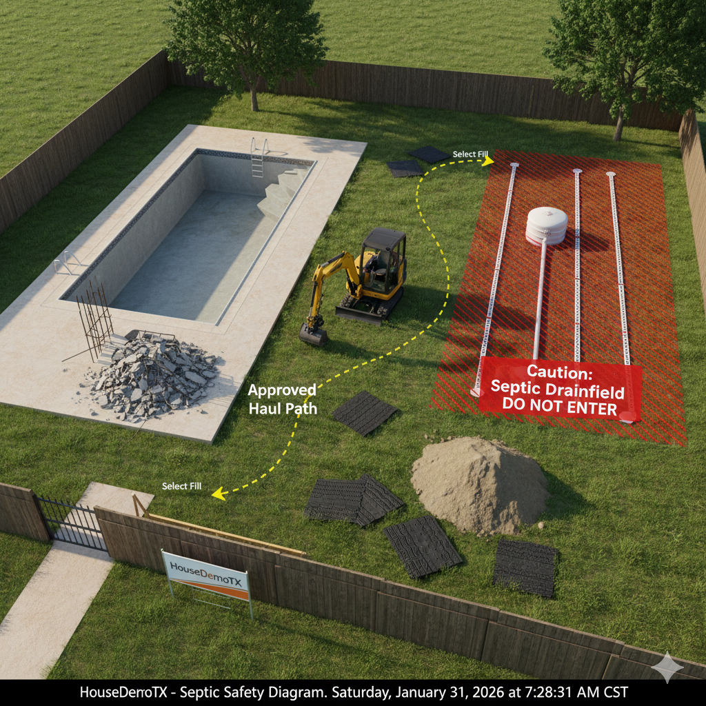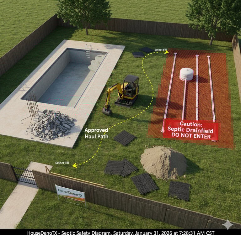 A "cheap" pool removal becomes the most expensive mistake of your life if it destroys your septic system. HouseDemoTX starts every rural project with a septic map review and a clear equipment path.